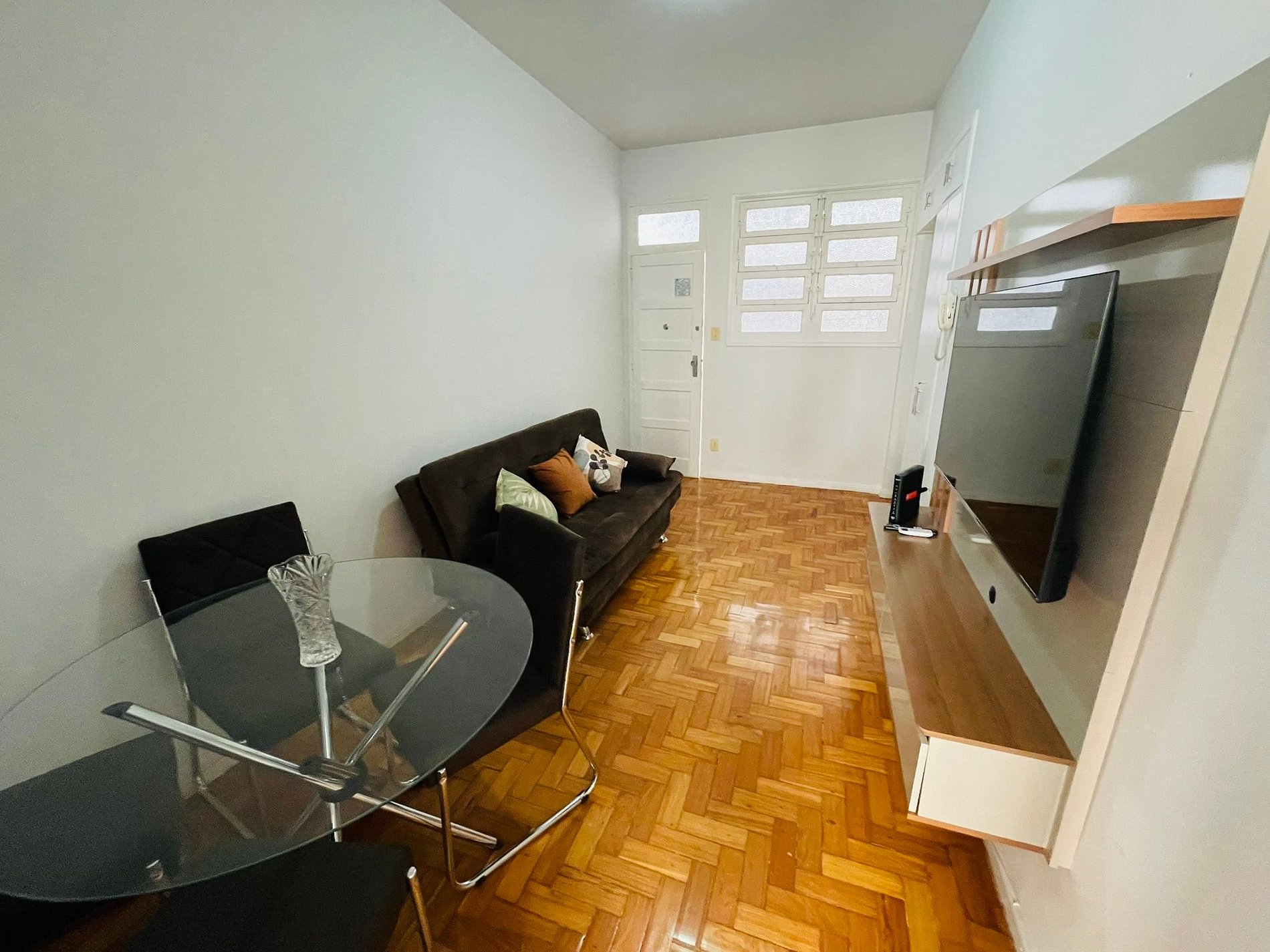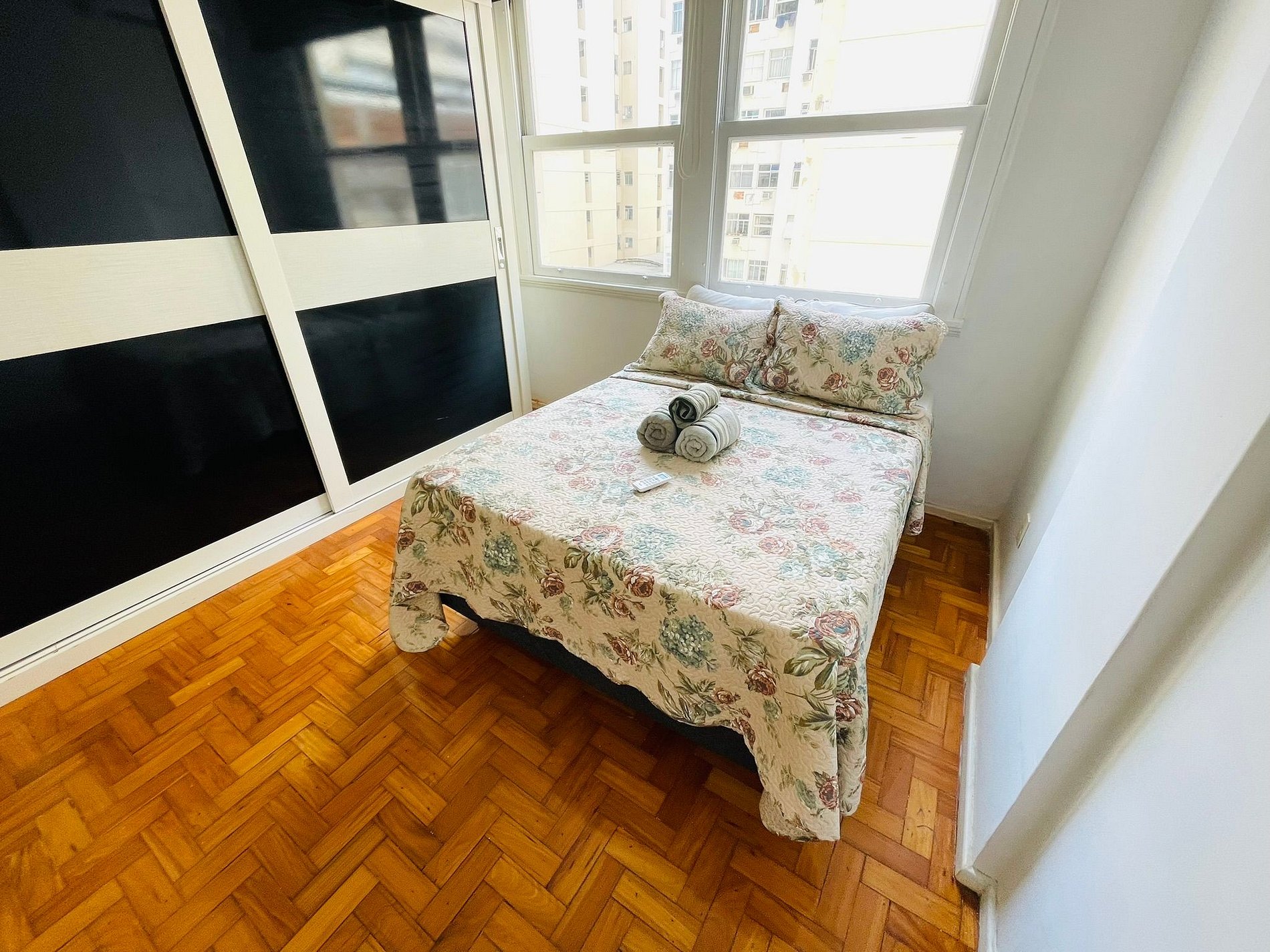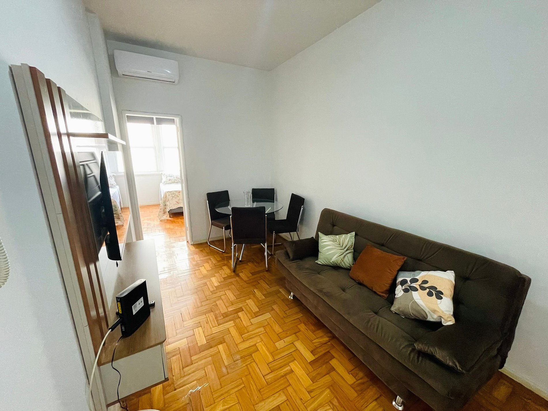 Conheça o nosso excelente sala e quarto para 3 pessoas em Copacabana. A sala conta com um sofá-cama de solteiro, mesa de jantar com 4 cadeiras, TV digital, Wi-Fi e ar condicionado split. No quarto: cama de casal, TV digital, guarda roupas e ar condicionado split. O apartamento também conta com banheiro equipado com box blindex e chuveiro elétrico. Na cozinha tem tudo do que você precisa: fogão, forno, geladeira e sanduicheira.