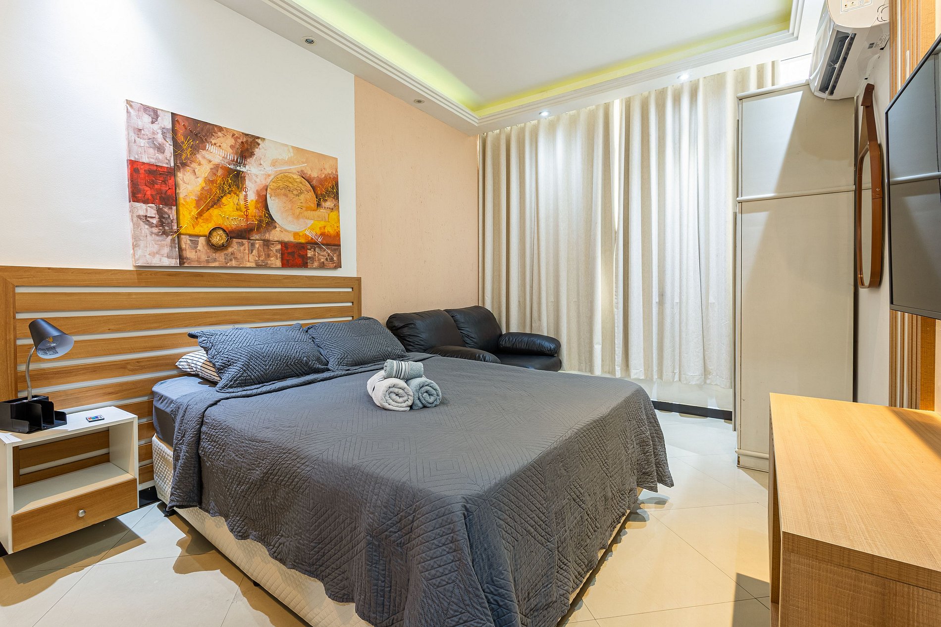 Decorado, TV com Smart (Netflix e Youtube) e janela antirruidos. A pequena cozinha é equipada de fogão cooktop, micro-ondas, cafeteira e frigobar. Banheiro com ducha a gás e secador de cabelo.