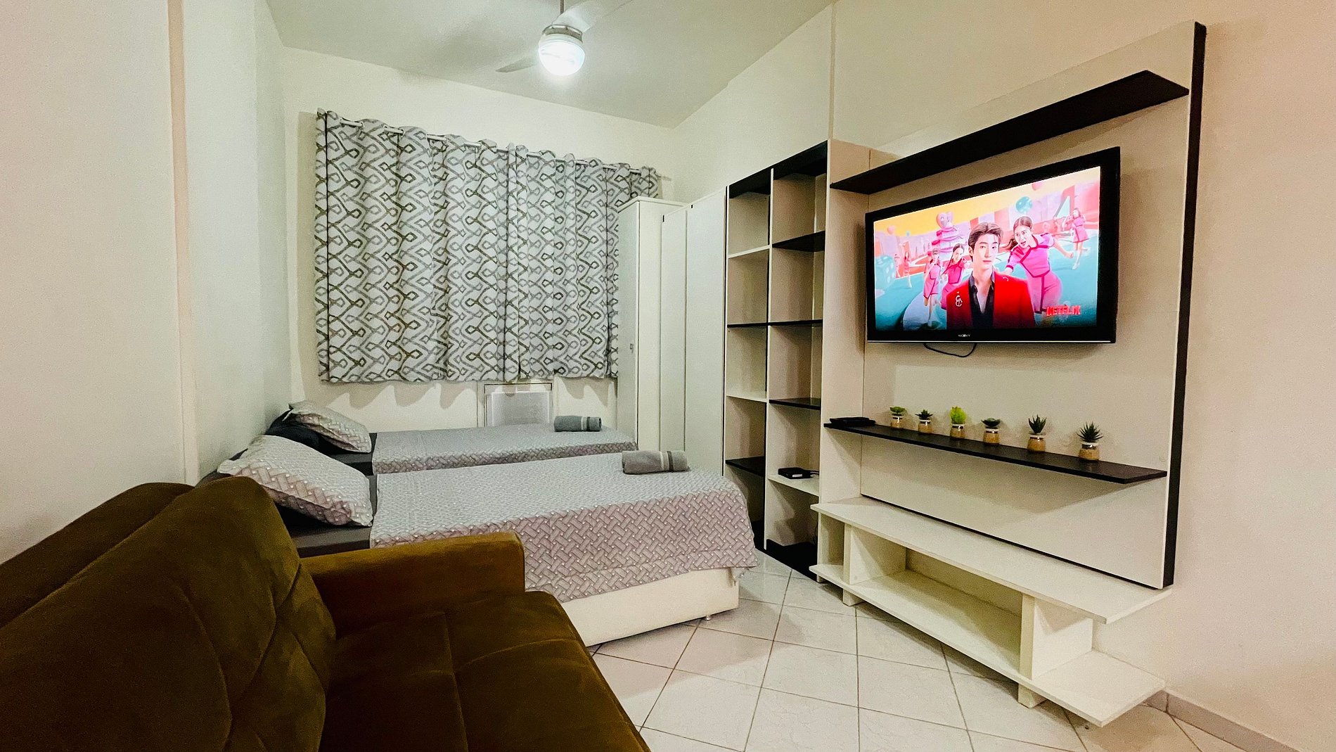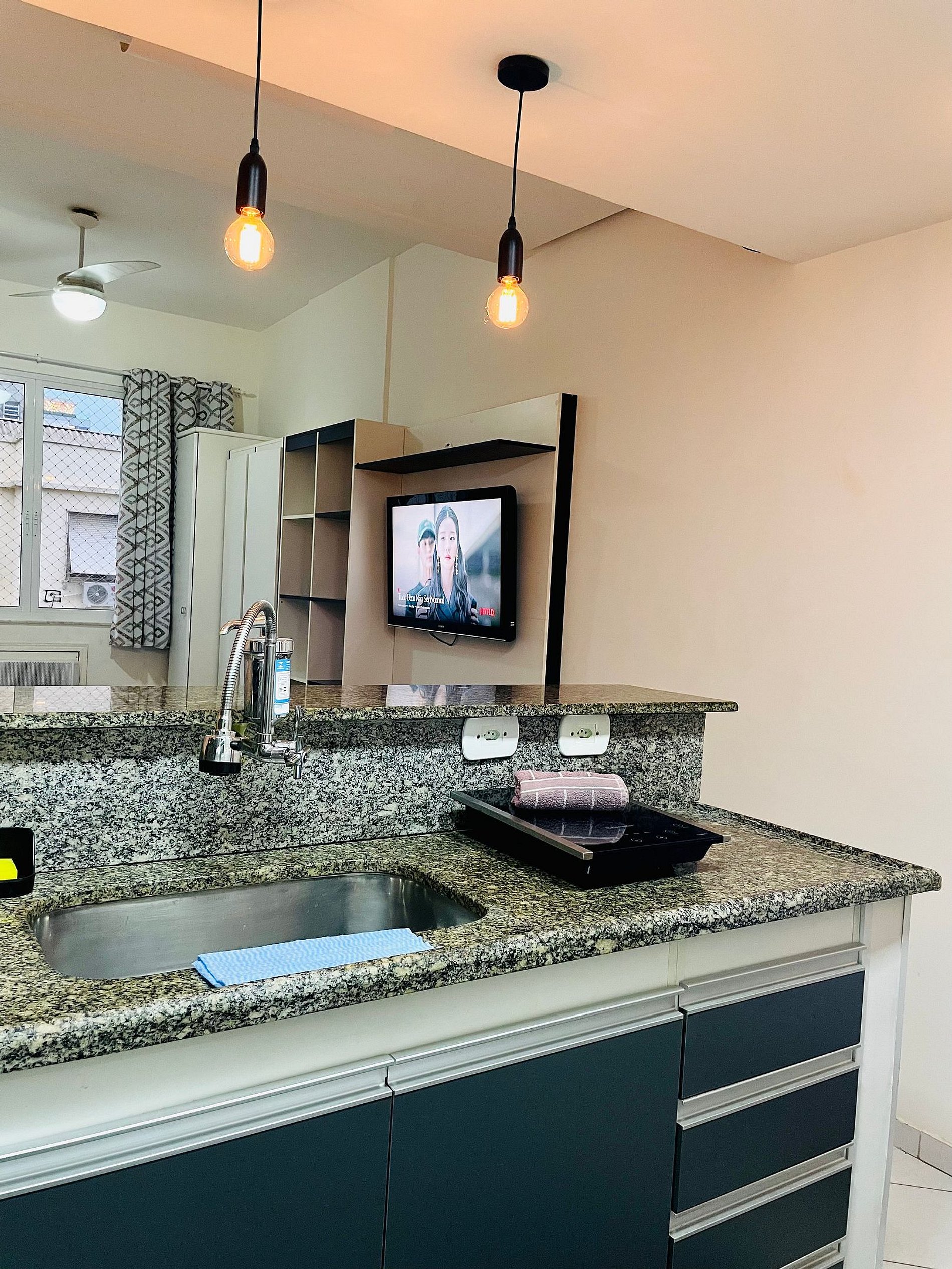 Aconchegante estudio no Leme a passos da orla! Possui todos os itens necessários para uma estadia confortável! Wi-Fi, TV com Netflix, ar condicionado, armário, duas camas de solteiro e um sofá-cama. Pequena cozinha americana completa com geladeira, microondas, cafeteira, cooktop, airfryer e outros utensilios. Banheiro com box blindex.