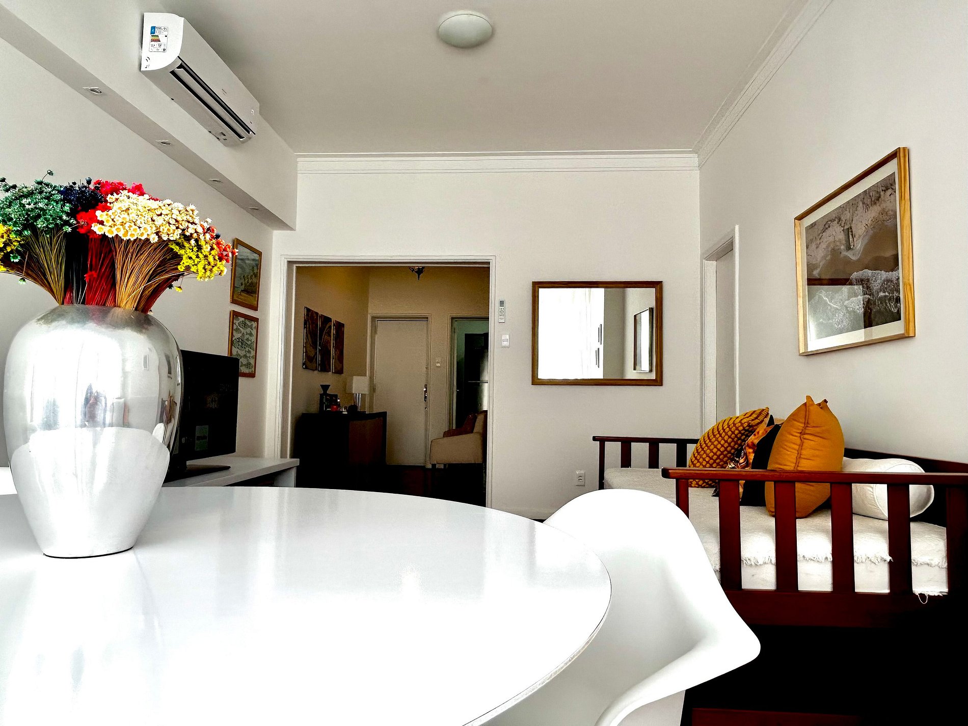 Apartamento com ar condicionado na sala e nos quartos, mesa de jantar para 6 pessoas, tv smart na sala. Quartos com cama de casal e duas camas de solteiro. Chuveiro com agua quente, através de aquecedor a gás. Cozinha completa.