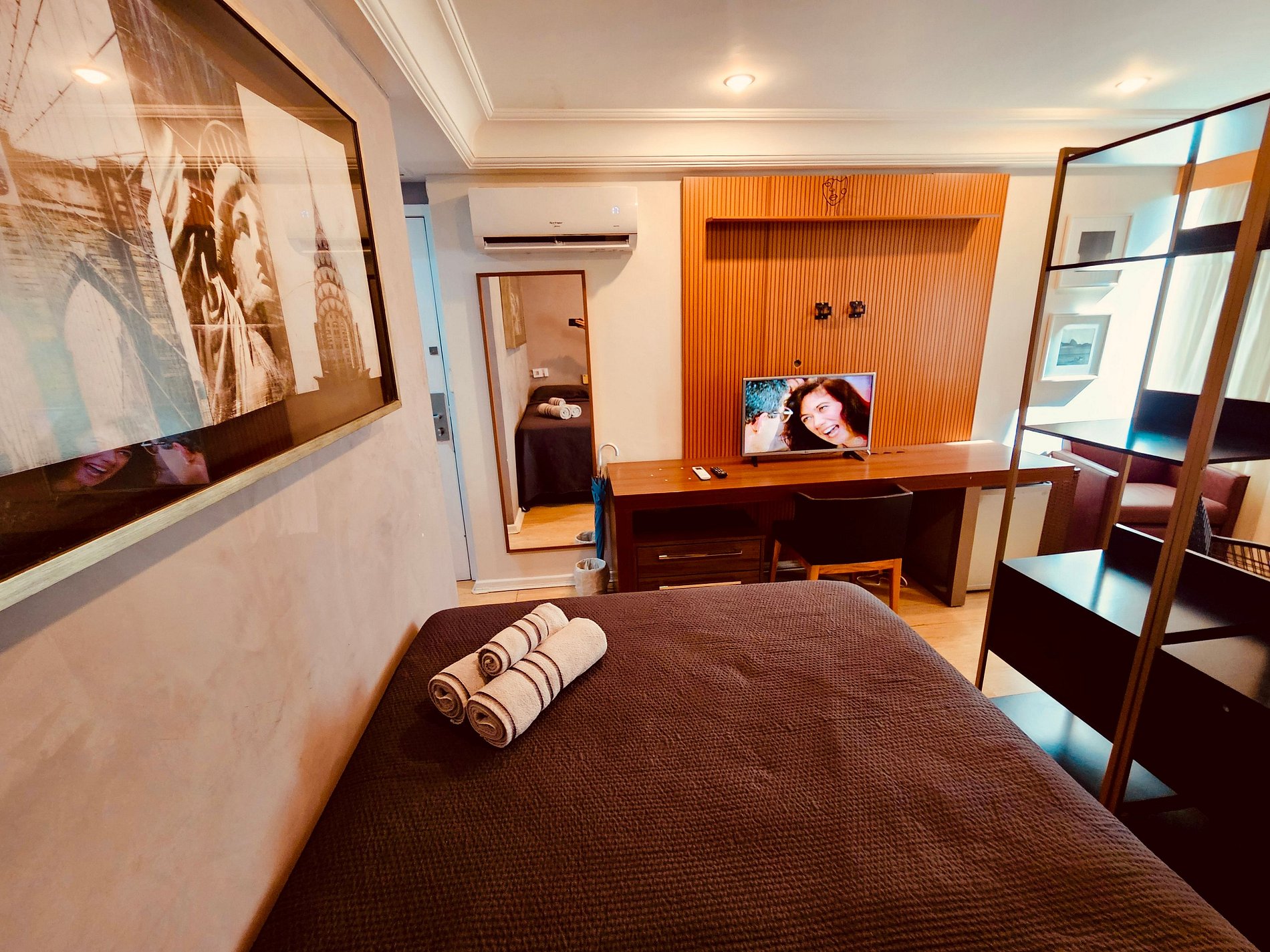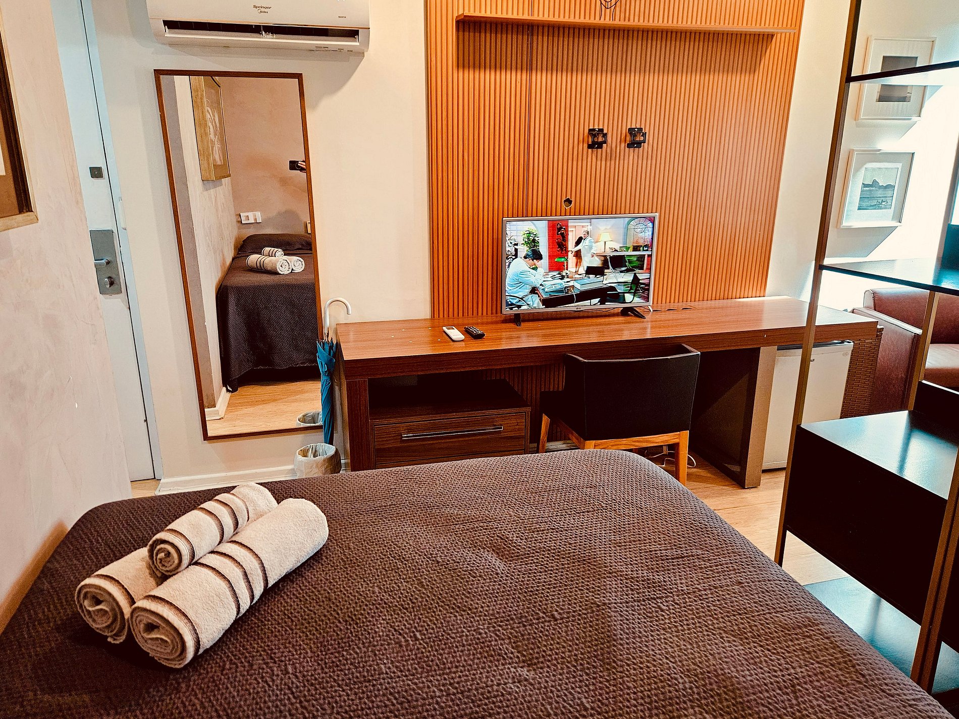 Conheça nosso aconchegante estúdio no Mediterrâneo Flat Barra da Tijuca. Cômodo único, cama de casal, TV, WI-FI, ar condicionado e arara para roupas. Pequena área com mesa de jantar e cozinha compacta com cooktop (uma boca), frigobar, cafeteira, chaleira elétrica e microondas. Banheiro com box blindex e chuveiro a gás. o nosso flat tem aproximadamente 20mts. O condomínio conta com piscina, academia, sauna seca e a vapor, quadra de tênis, Balsa gratis para acesso a praia e recepção 24h.