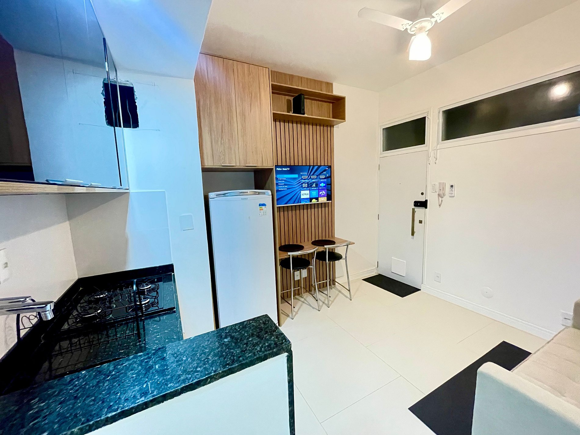 Maravilhoso estúdio (32mts) super moderno (reforma de 08/2024) , a poucos passos da areia. Totalmente climatizado com design clean e moderno. O apartamento é muito silencioso, com vista livre de fundos. Quarto com armários e espelhos de corpo inteiro. Banheiro moderno com lavadora de roupas. Cozinha americana com geladeira grande, cooktop e implementos básicos de cozinha, Sala com Smart tv e um sofá cama confortável q atende a um casal q durma bem juntinho. In Rio Tour, a sua casa no Rio!